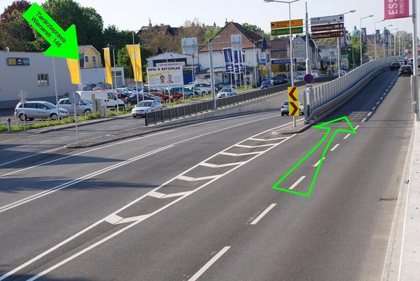 | Sobald Sie rechterhand den Obi-Baumarkt erblicken, wechseln Sie auf den linken Fahrstreifen. | ![]() |